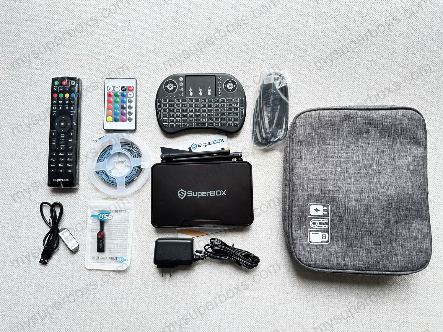 Get exclusive essentials to enhance your viewing experience. From a sleek travel bag, vibrant RGB light strip, to expansive storage options with a USB drive and micro SD card. Navigate with ease using the keyboard remote, keep your space tidy with cable management ties, and maintain a spotless screen with our cleaning kit. It's everything you need for a complete entertainment upgrade. Shop SuperBox accessories now.